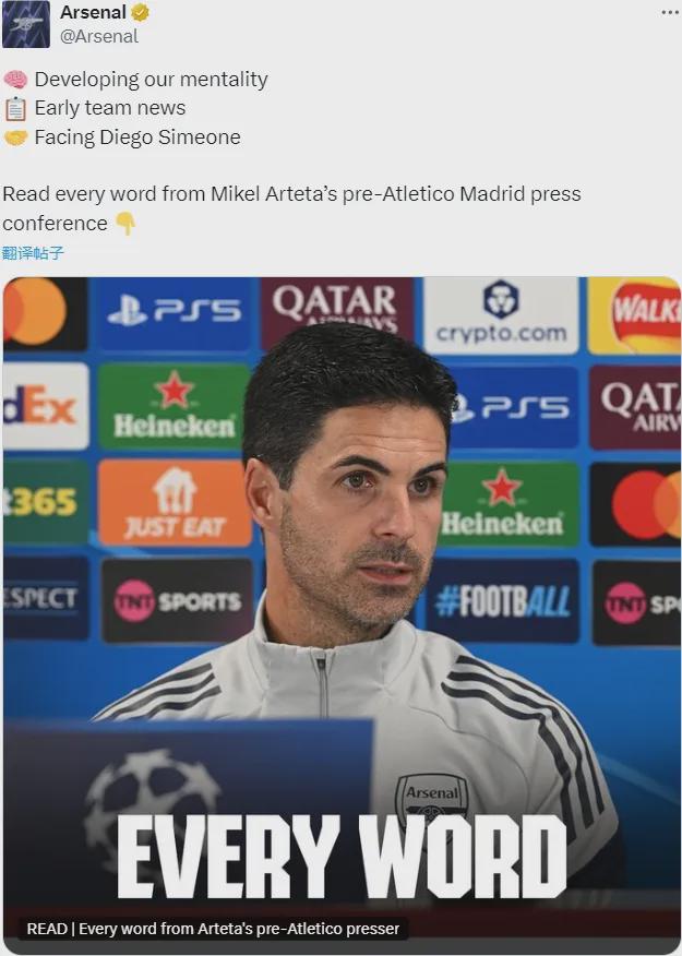 阿尔特塔出席了阿森纳对马竞的赛前新闻发布会,我们来简单看看伤病等问题。